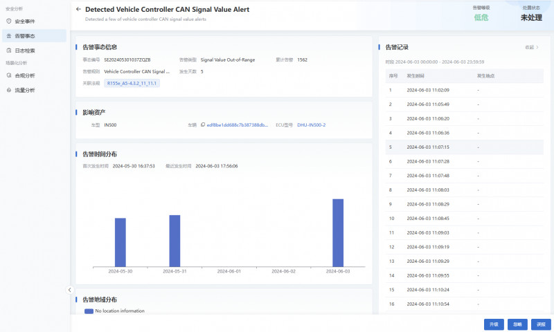 ·关键指标集成:整合未处理告警、待处理工单、车型状况、漏洞统计,实时展现车型安全状况