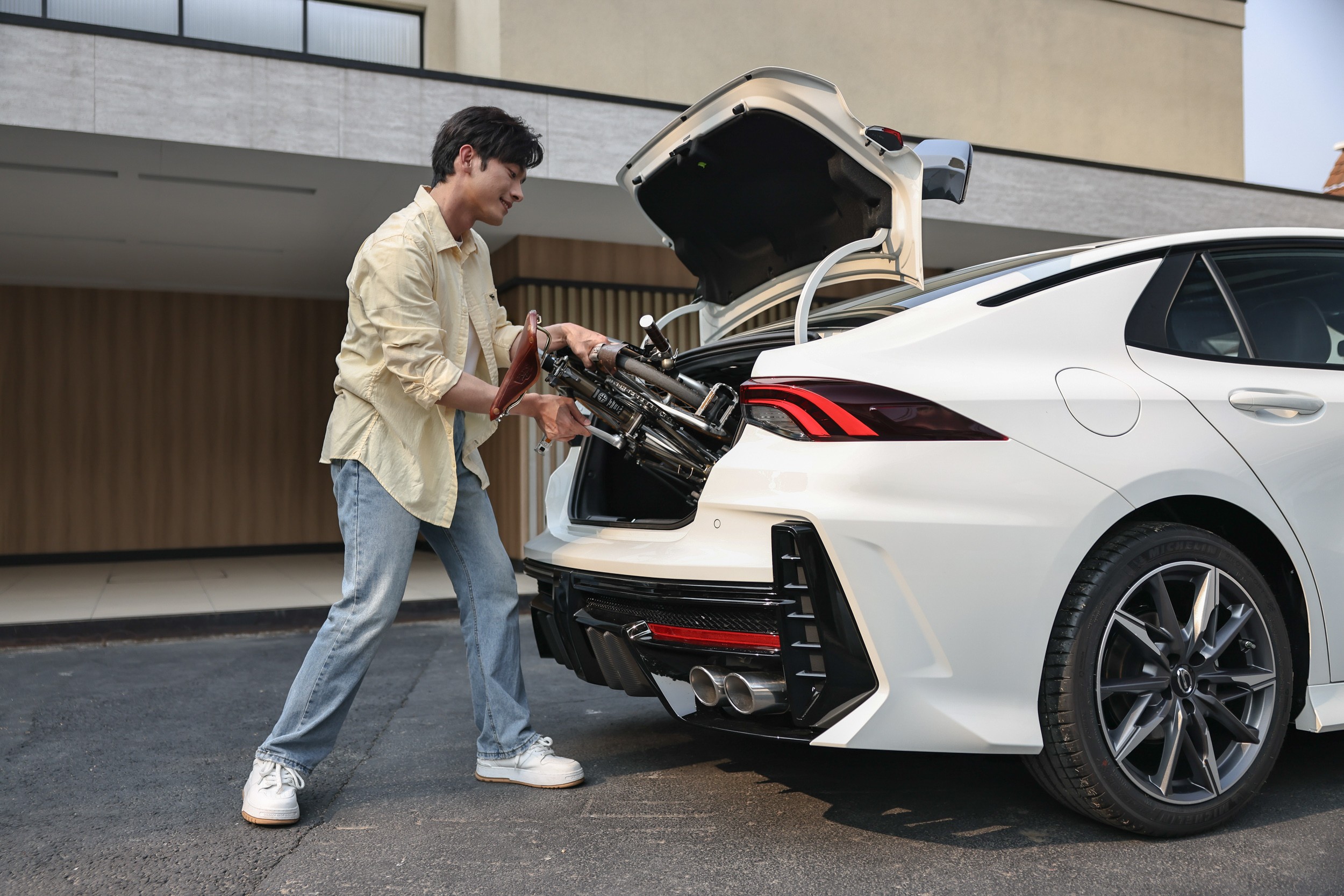并且影豹的外观设计称得上动静皆宜,低趴宽体的车体姿态搭配独具辨识度的前脸设计彰显蓄势待发的气势,机盖线条顺着A柱呈弧线划向车尾,组成一幅弓的形状,配合原厂定制的镂空尾翼拉满空气力学Buff,为影豹带来了0.26的风阻系数,强化整体运动属性的同时且实用。加上自带的米其林轮胎及双边四出排气,给你带来定制般的体验。